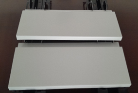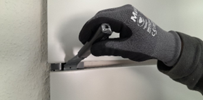 Paneele können mit einer Kappzusäge zugeschnitten werden. Die beschichtete Seite nach oben und von unten eine passende Auflage verwenden. Um Wellen im Material zu vermeiden werden Längsschnitte mit dem Messer geritzt und gebrochen.Rechtwinkligkeit, Wärmedehnung, Zusatzlasten, Sonderbereiche